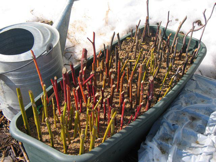 Зимой черенки размещают в прохладном и темном помещении – например, можно закопать их в песок в подвале. В феврале нужно укоренить черенки. Для этого их ставят в воду и накрывают пакетом. Когда появятся листья и корешки, пакет снимают. Черенки высаживают в специальную смесь. Важно сделать в баночке несколько отверстий – это поможет избежать гниения корешка из-за обильного полива. Высадка в открытый грунт осуществляется в апреле.